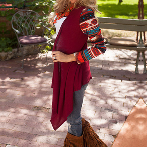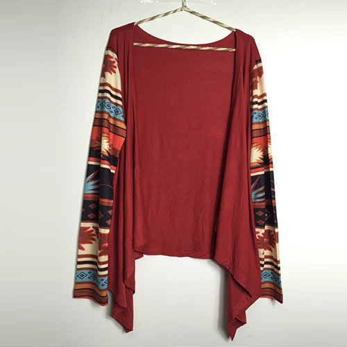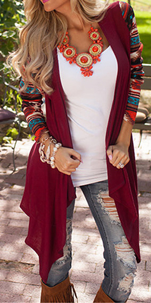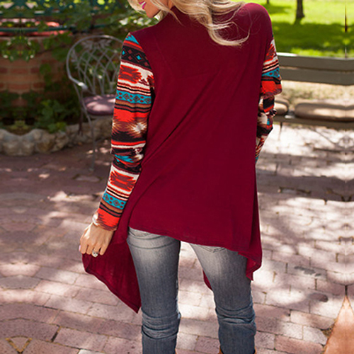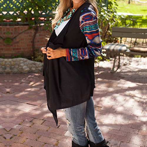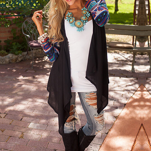 to keep chilly breezes at bay. Printed spliced style,with an irregular hem design,this cardigan