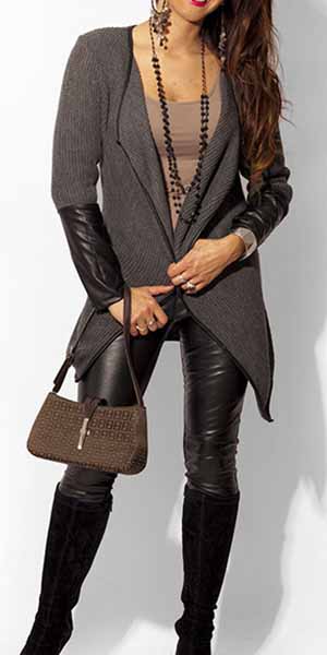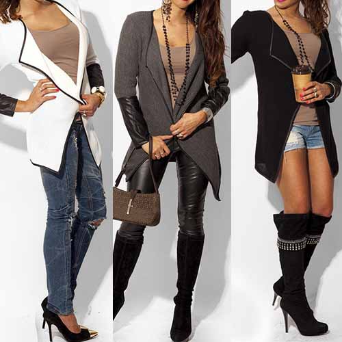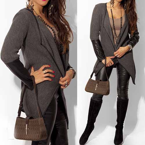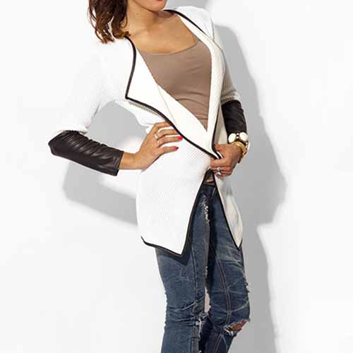 with PU leather spliced design,outfitted with long sleeve,lapel,and an open-front,chic and stylish.