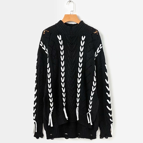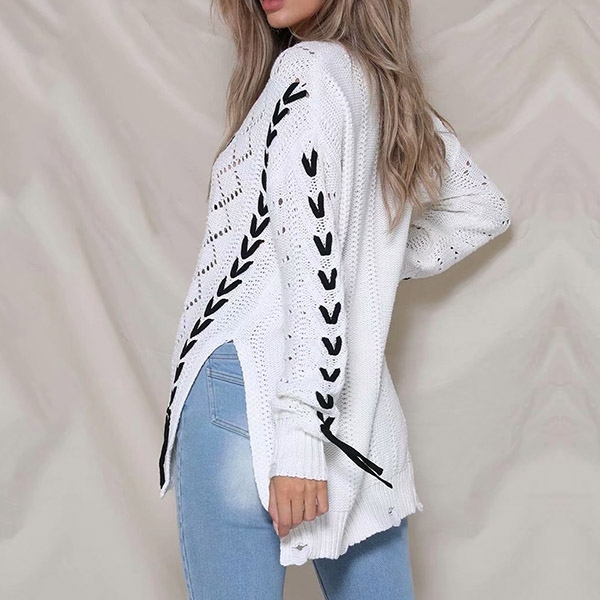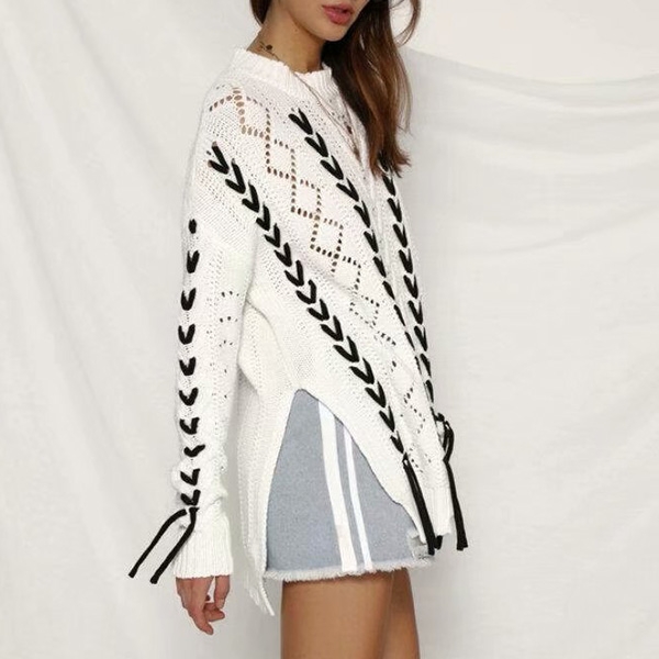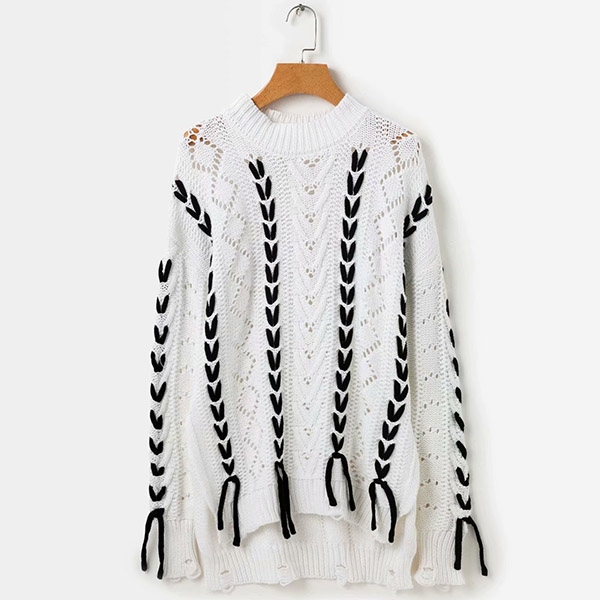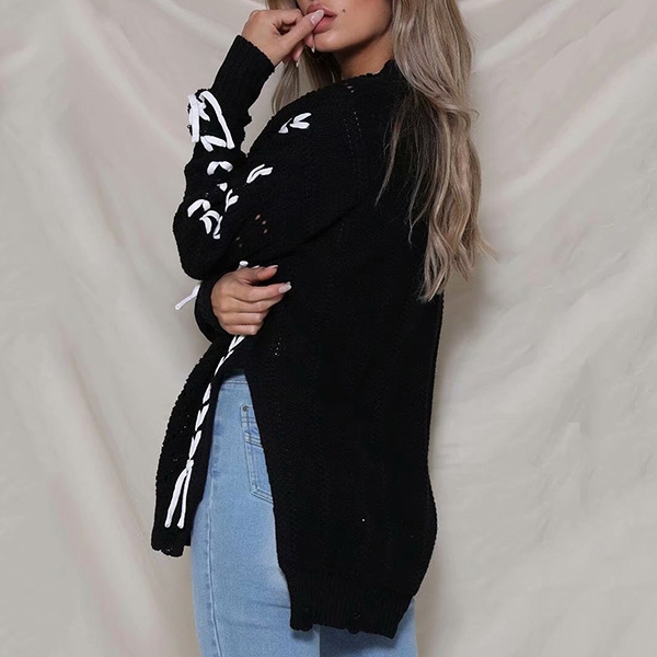 round neckline, ribbed trim, come with hollow out design and contrast color lace-up accent,