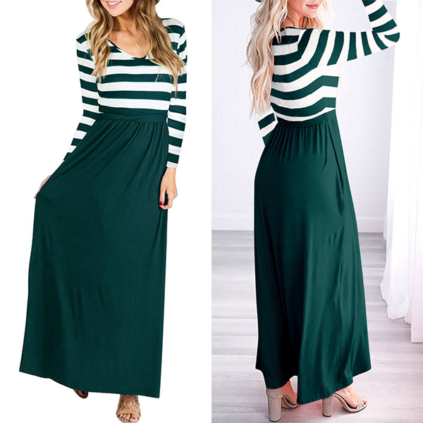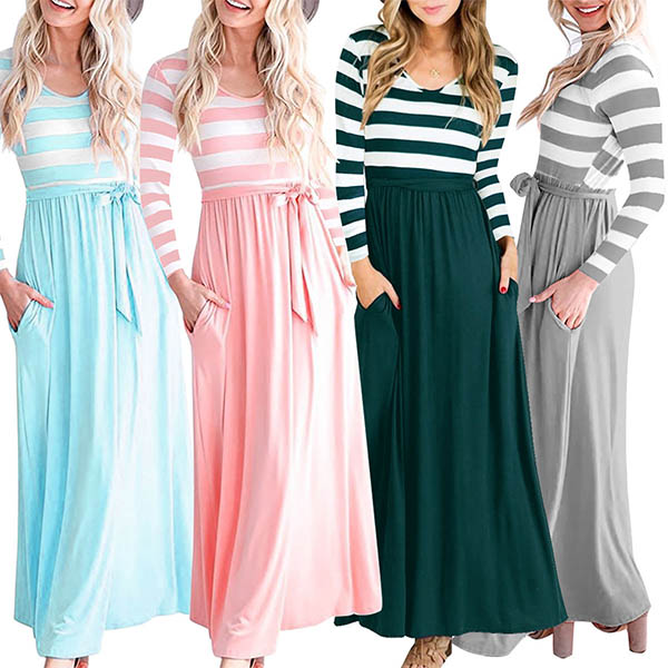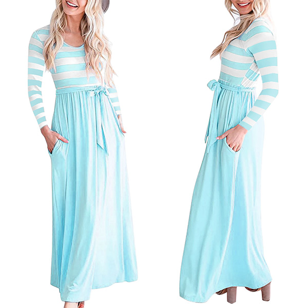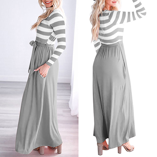 an allover stipe bodice spliced design, a long sleeve, a round neckline, a self-tie waist,