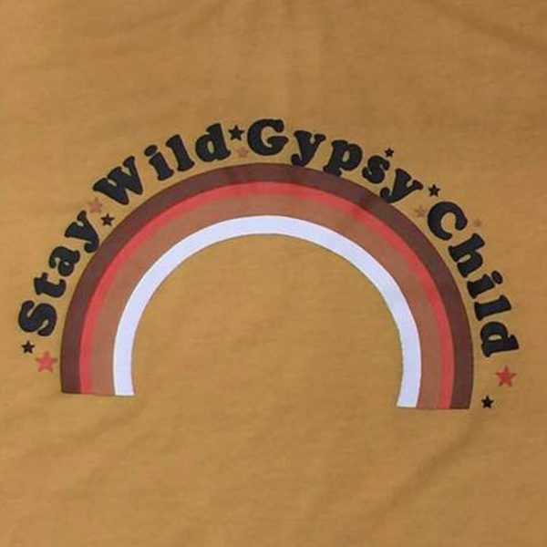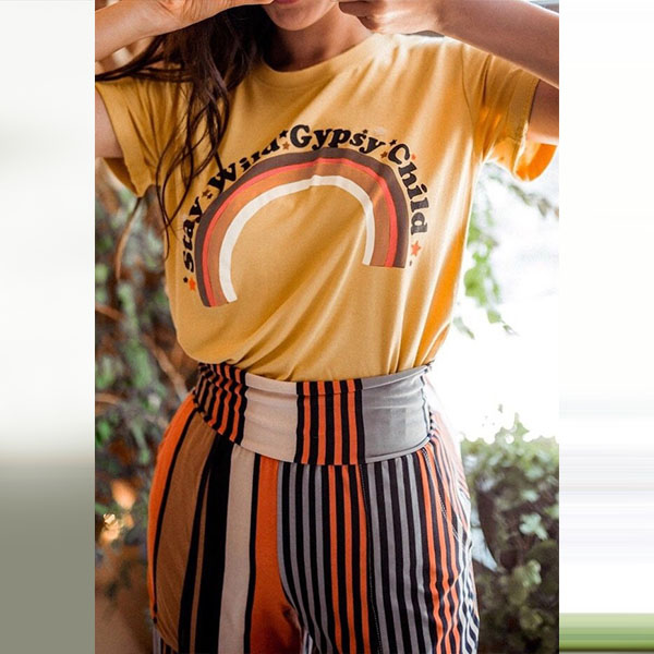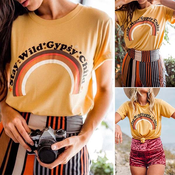 The shirt in a cozy and soft polyester fabric woven,with round-neck and short sleeve.Rainbow and letters printed
