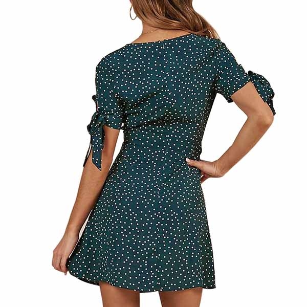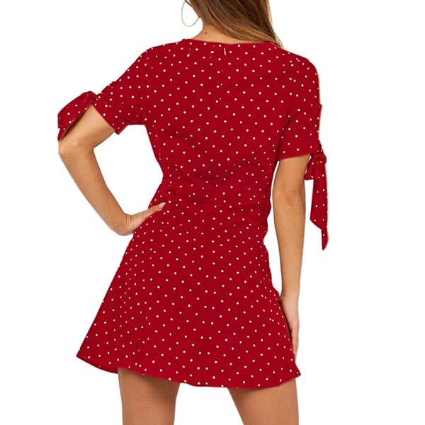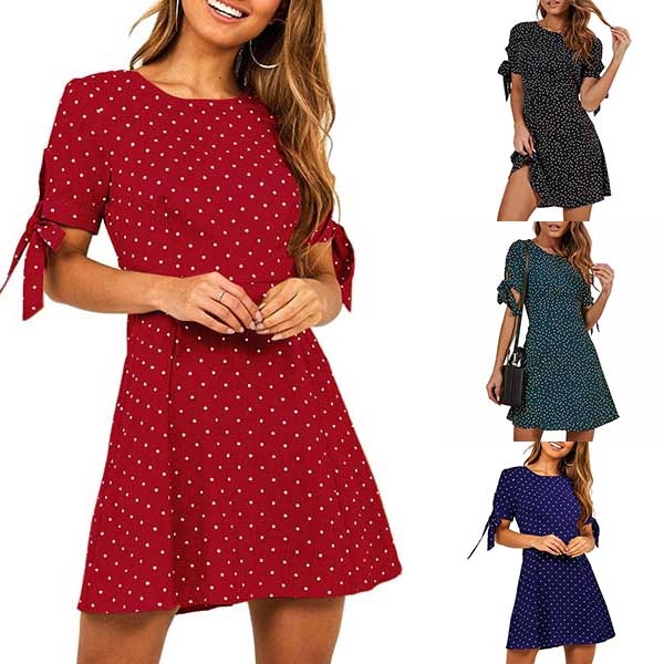 in a figure-flattering silhouette printed in an allover polka dot pattern, cast in a short sleeves with
