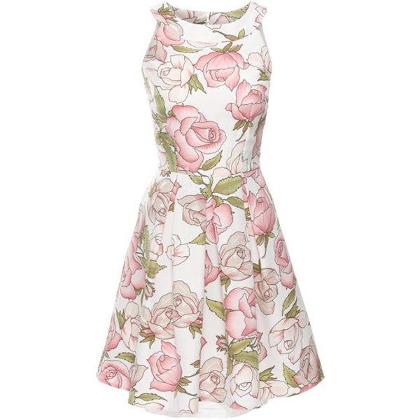 feature a fit-and-flare silhouette with an allover floral print, a round neckline, a sleeveless cut, a back button closure.