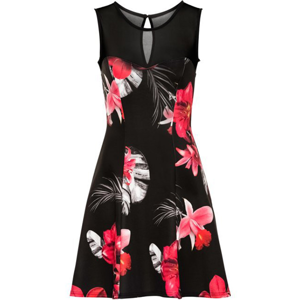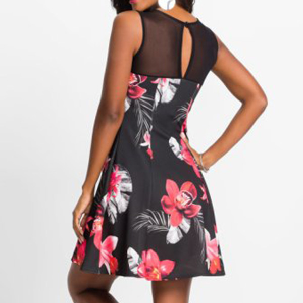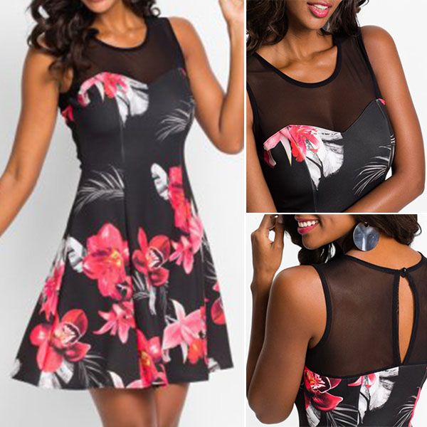 silhouette with an allover floral print, a sheer mesh spliced design, a round neckline, a sleeveless cut,