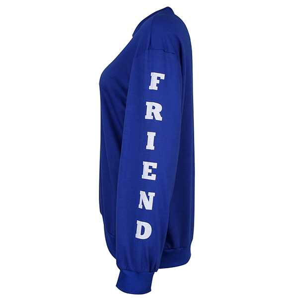 ”friend” print on the sleeves for adding some trendy vibe to your look, put on your fitted jeans and