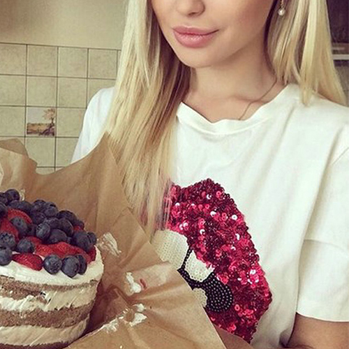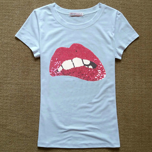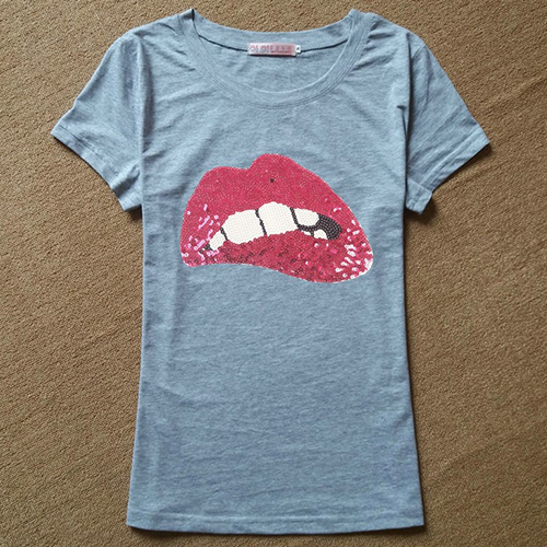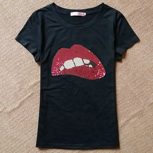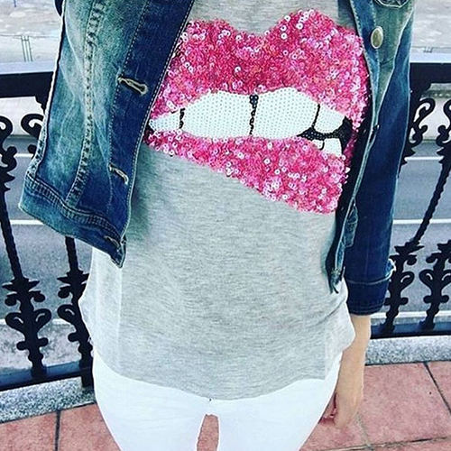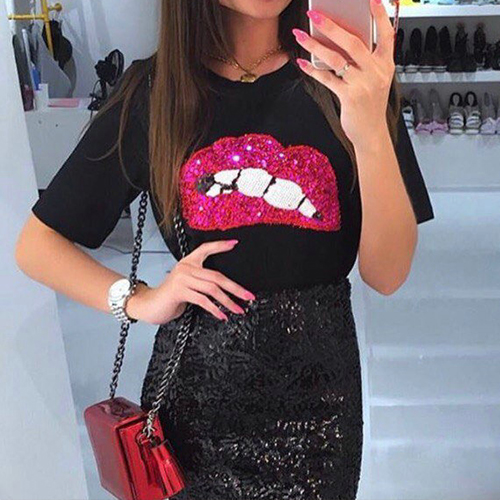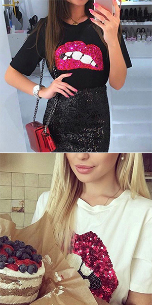 So unique and stylish T-shirt! It is decorated with sequin lips design and short sleeve round neck