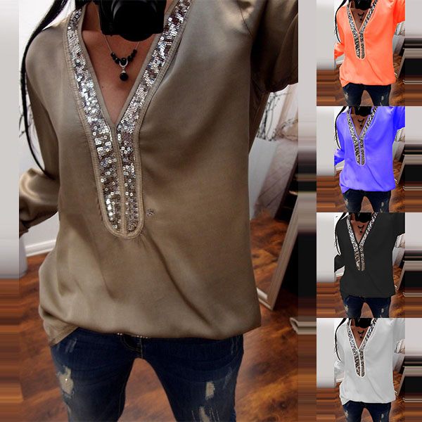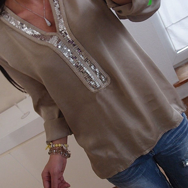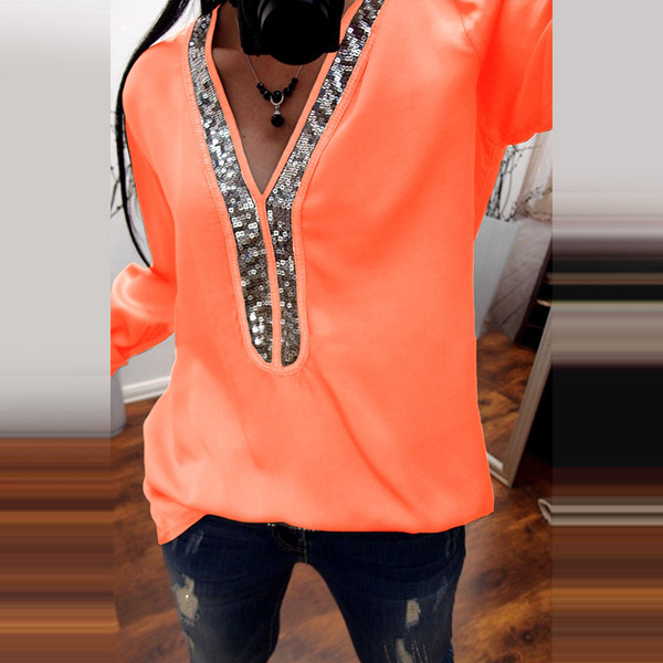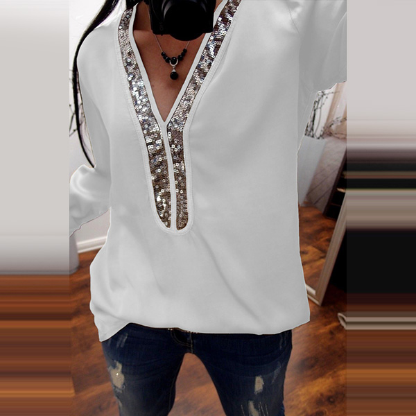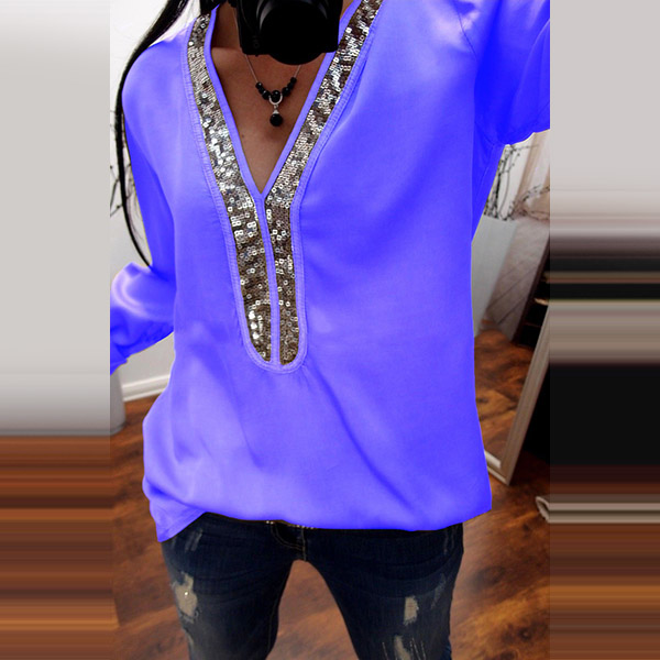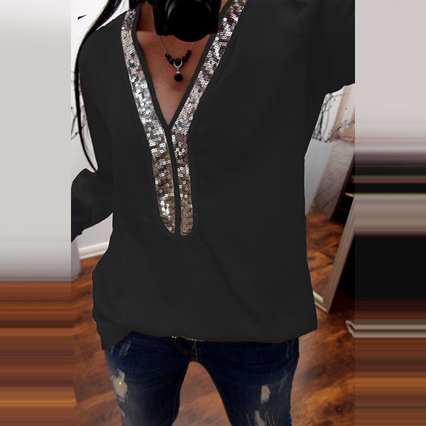 is the sequin spliced v-neck design,which is sure to boost its charm. We suggest you matching with