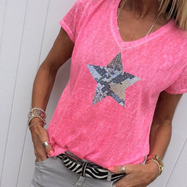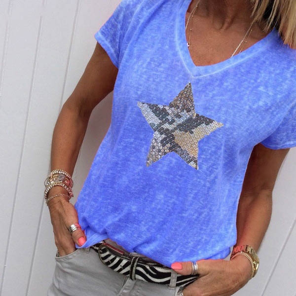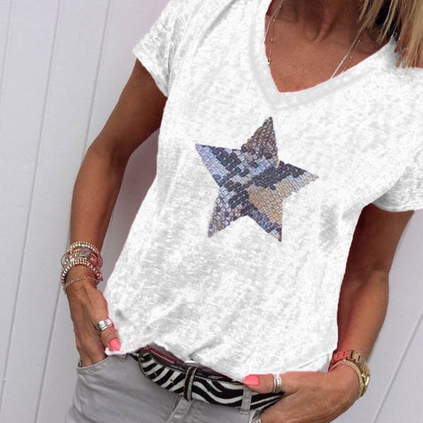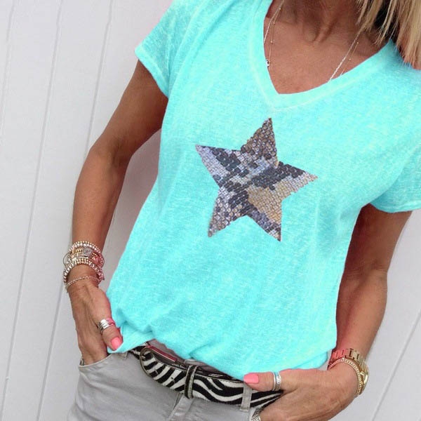 with short sleeve and v-neck design,the sequin star design boosts its charm. No matter what kind