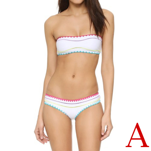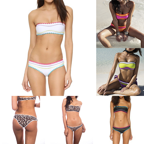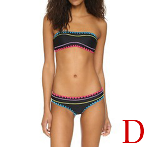 There are many different patterns and colors for the bikini set. It is styled with strapless patterns,