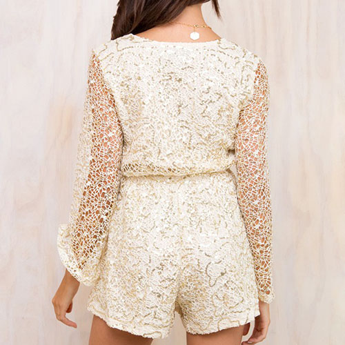 appeal when you slip into this item. It features solid color and lace hollow out patterns, with deep V-neck and long sleeve