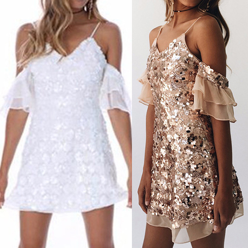 It is completed with solid color and ruffle sleeve patterns, sexy and stylish. The sparkle sequins add some
