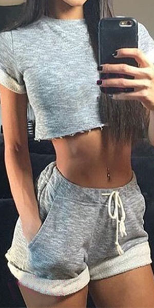 Solid color style,including a short sleeve round neck crop tops and an elastic waist shorts,