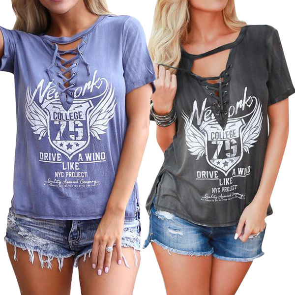 short sleeve,lace-up v-neck and slit hem,this printed t-shirt can keep you cozy yet feminine. Perfect for matching with