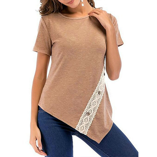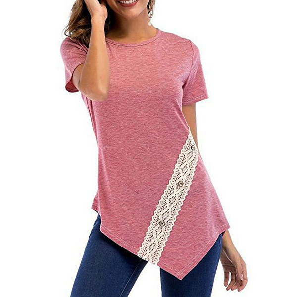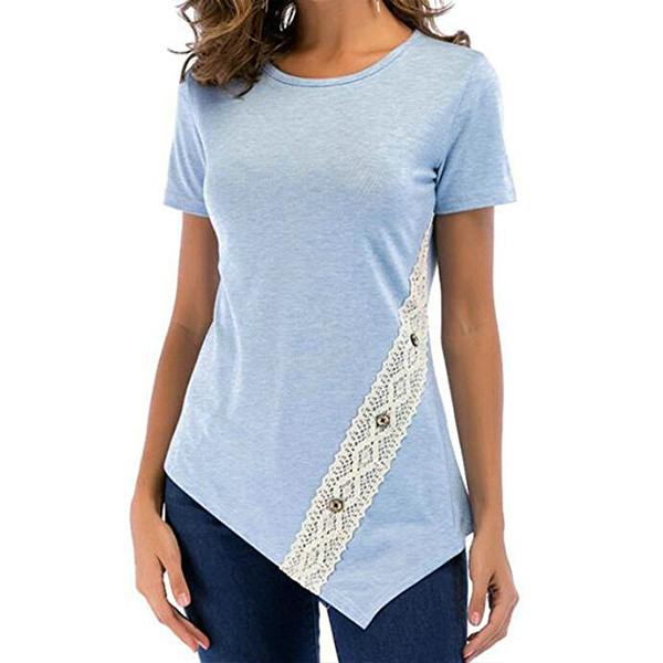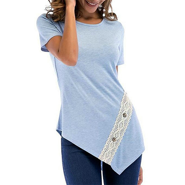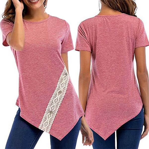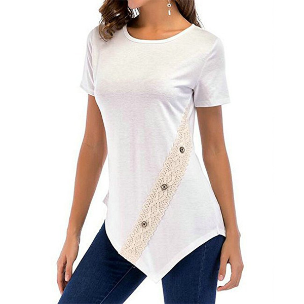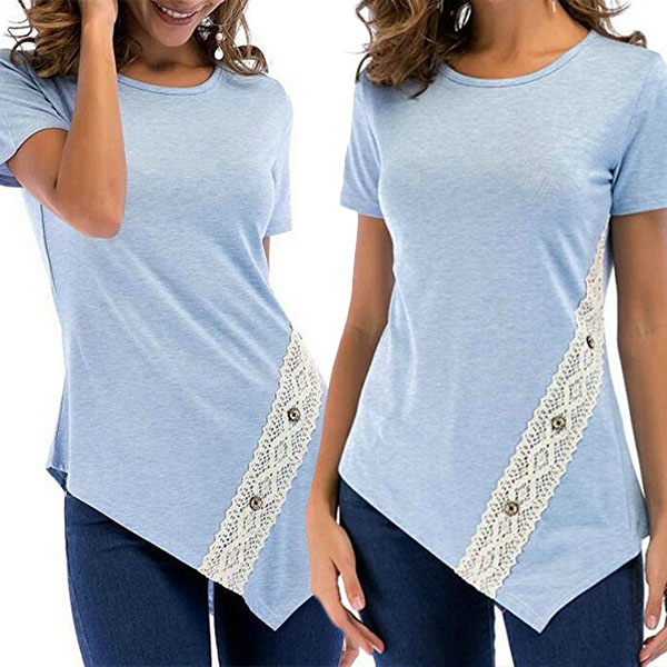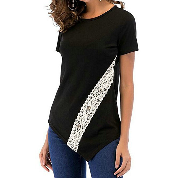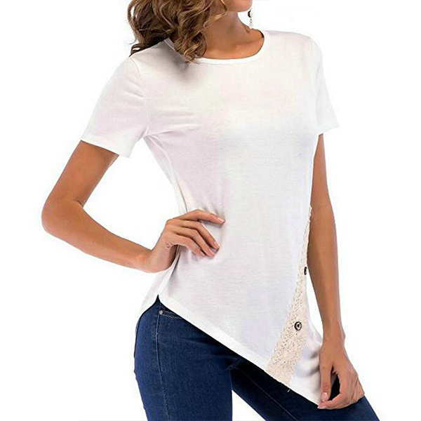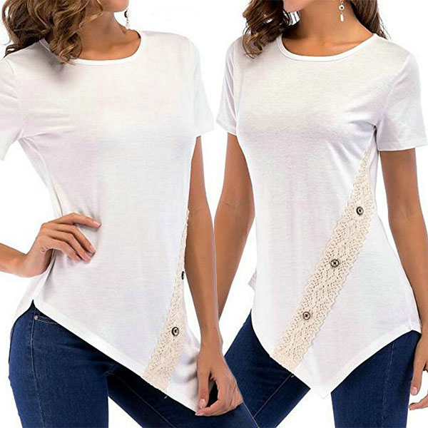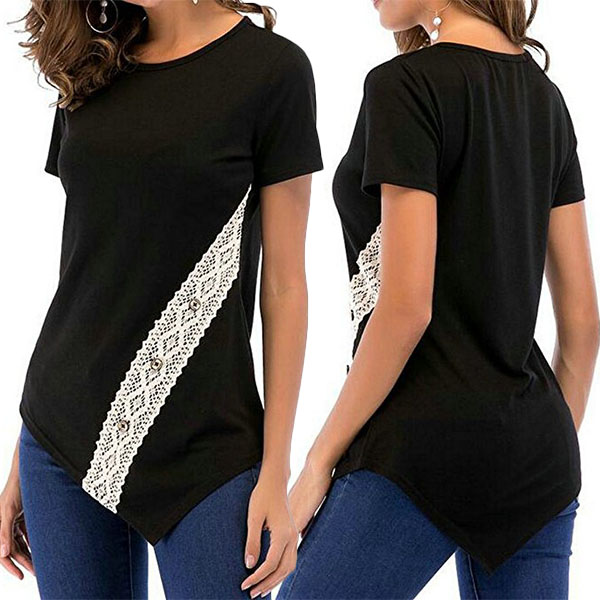 this t-shirt can ensure you a comfortable day,while the lace spliced irregular hem design makes it look more attractive. Like it? Then buy one?