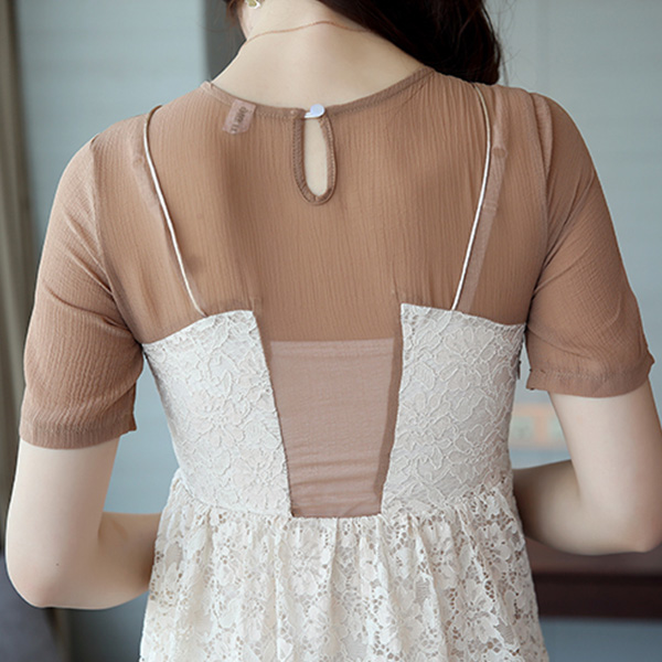 At your first sight,you may think it is a two-piece set,but actually it is not. Lace spliced and contrast color design gives you