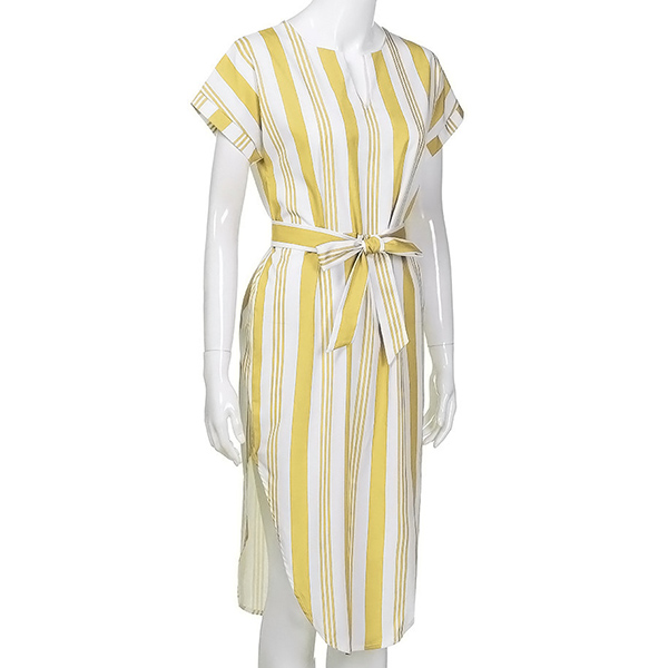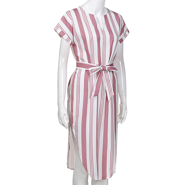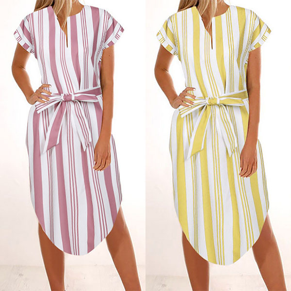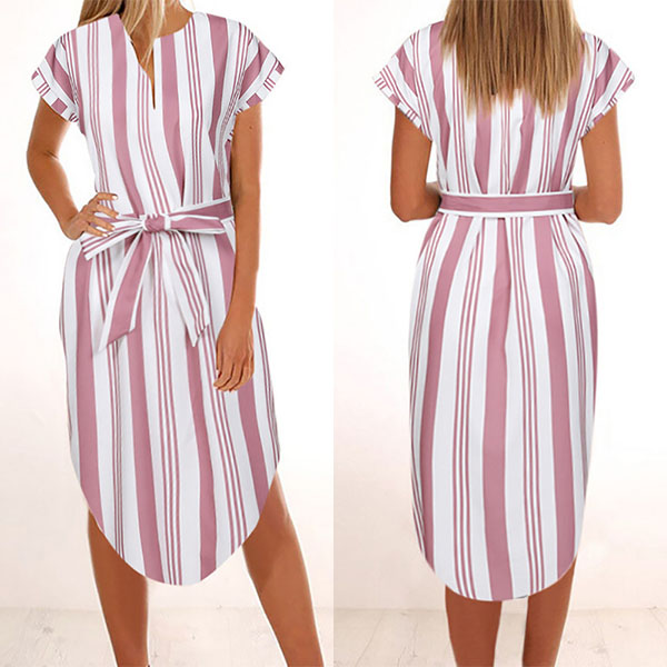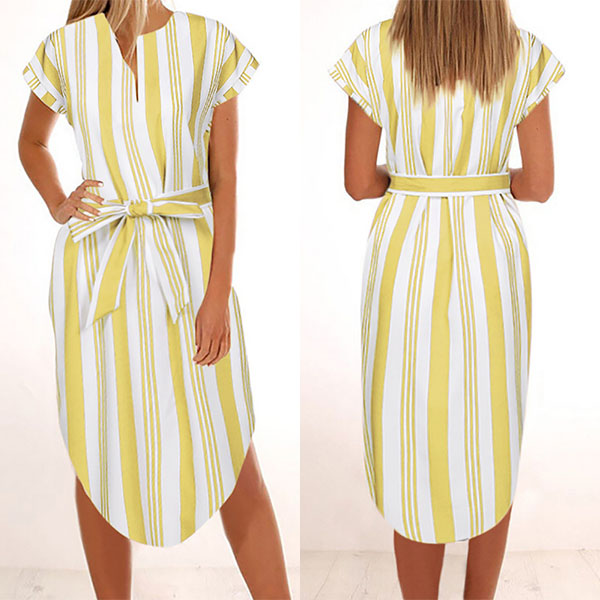 Striped style,finished with short sleeve,v-neck and an irregular hem,this dress definitely knows