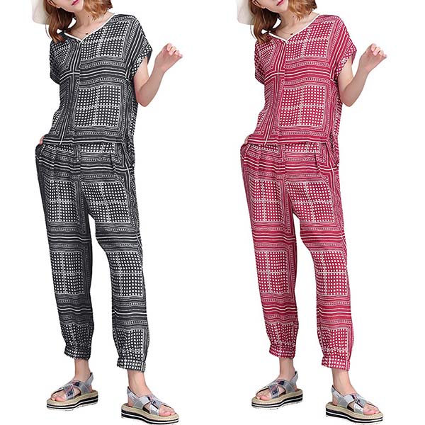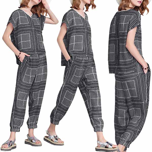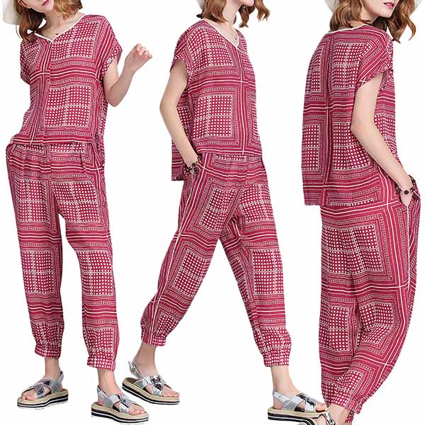 printed pattern,including a short sleeve v-neck top and a high waist harem pants,this two-piece set of course