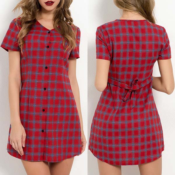 This dress is designed with plaid element,stylish and popular. Finished with short sleeve,v-neck and