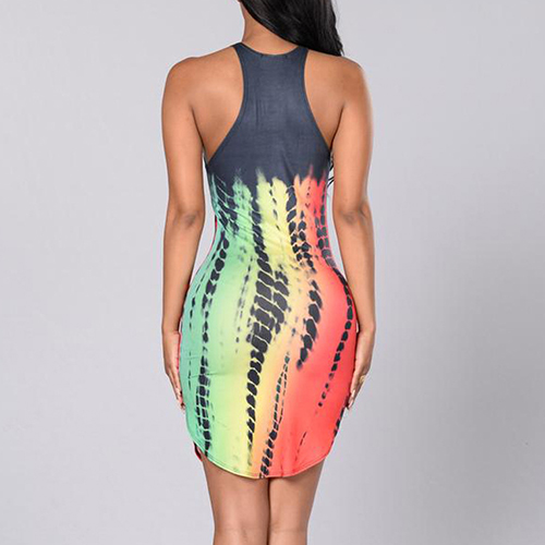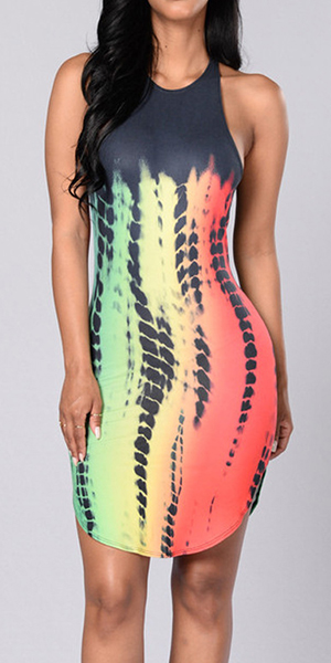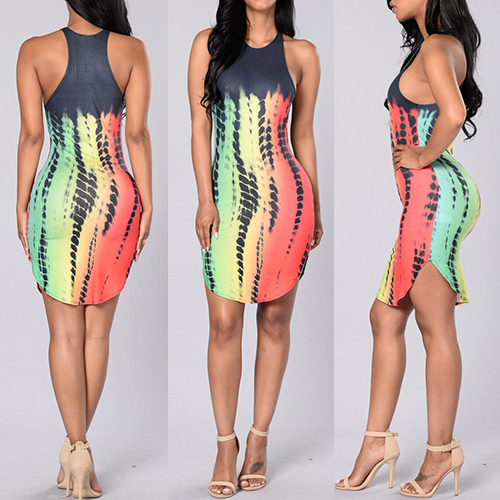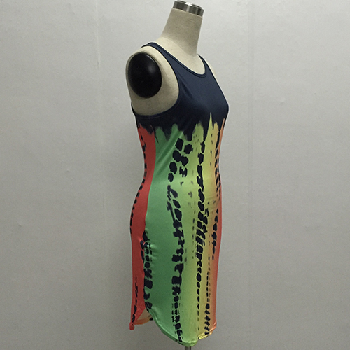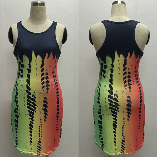 eye-catching printed pattern,with sleeveless,round neck,arcuate hem and a fit silhouette,this