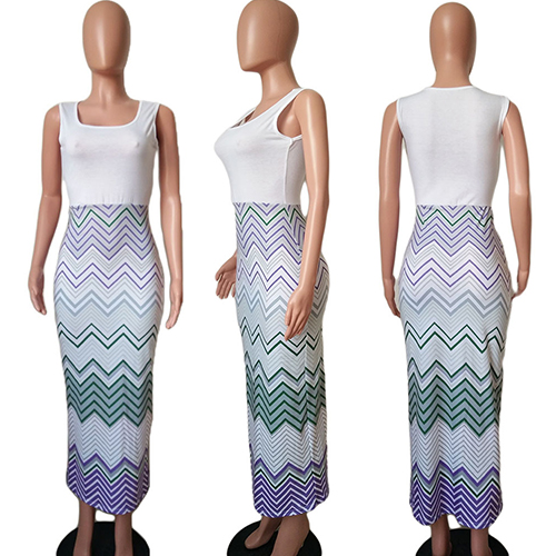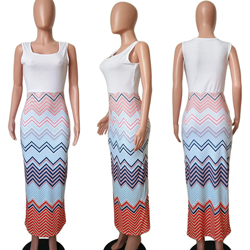 Designed with sleeveless,round neck and a maxi length,simple and stylish. Plus,its colorful wavy striped hem makes this piece