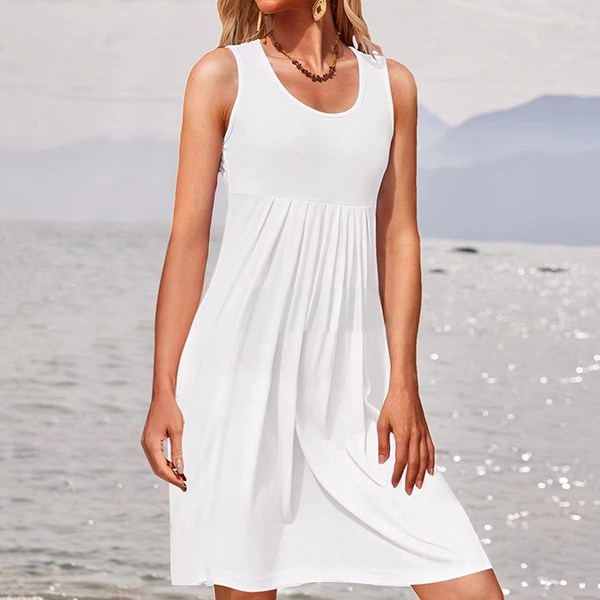 For these warm-weather days,this sleeveless dress would be a good choice. Solid color style,finished with sleeveless,round neck,high waist and lace spliced design,this dress not only can give you a cool and comfortable day,but also can offer you a stylish look.