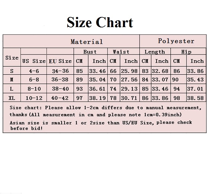 XL : Bust : 97cm(38.19"); Waist : 78cm(30.71"); Hips : 98cm(38.58"); Length : 86cm(33.86");