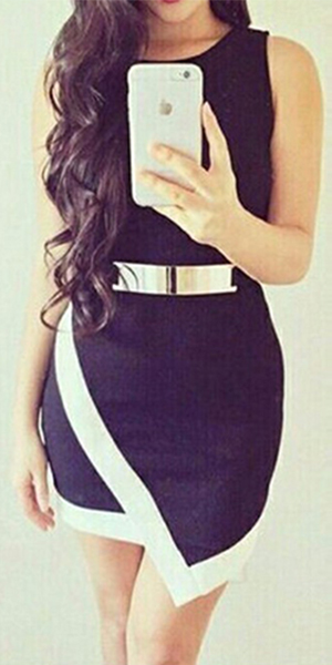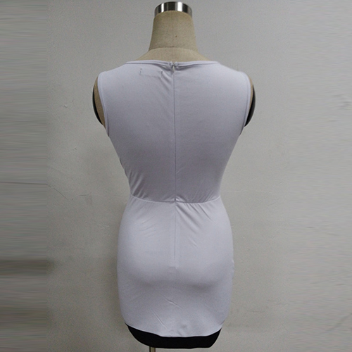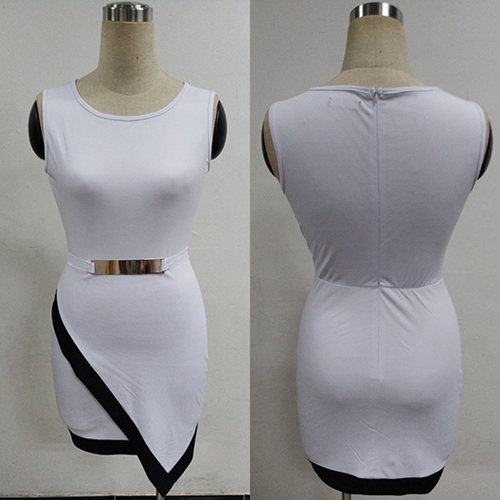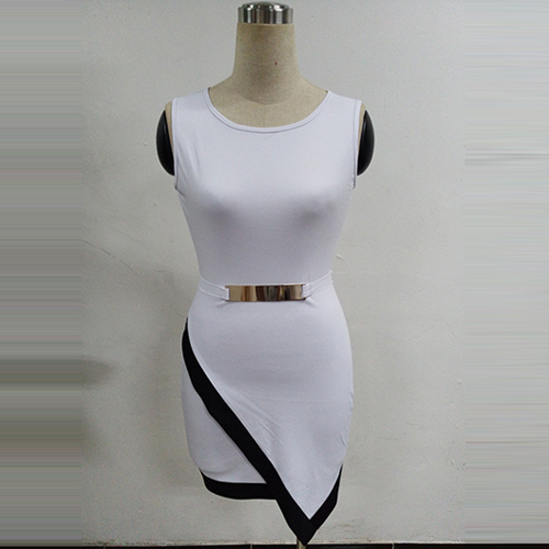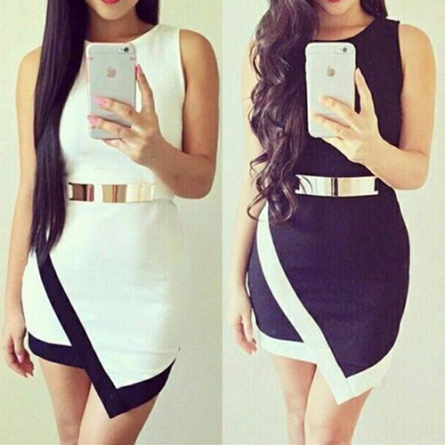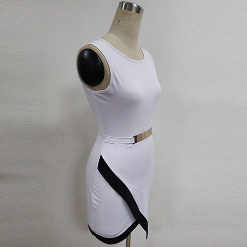 This dress features contrast color style,with sleeveless,round neck and irregular hem design,