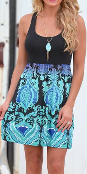 Designed with sleeveless,round neck and a floral print spliced hem,this dress will take