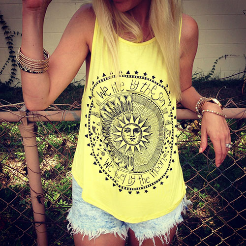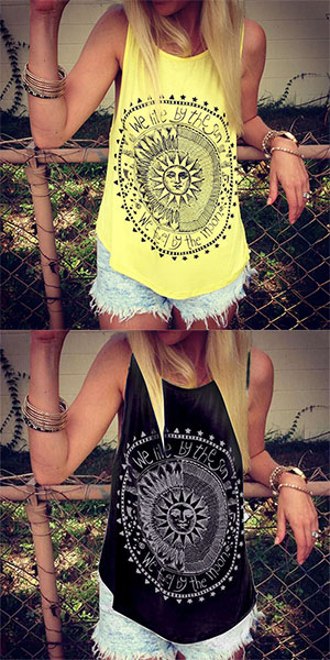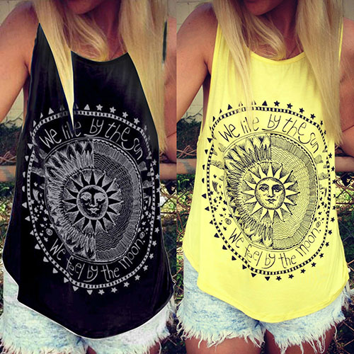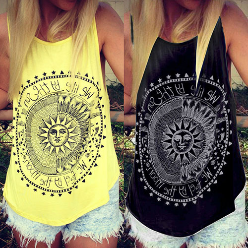 Features sunflower printed pattern,with sleeveless,round neck and a loose silhouette,this piece