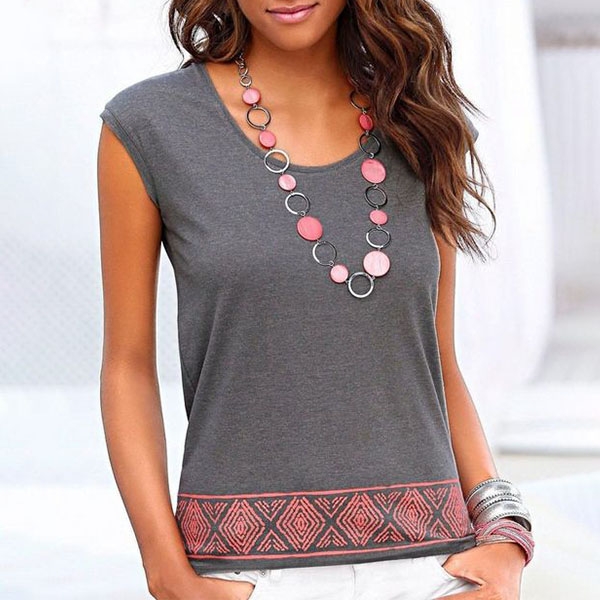The printed details at the hem part makes it look not so simple. Finished with sleeveless and round