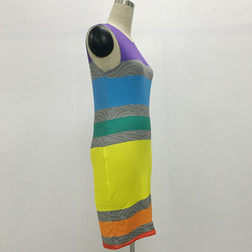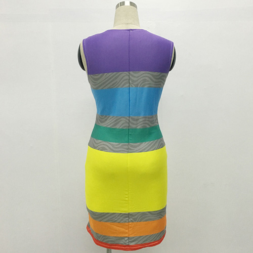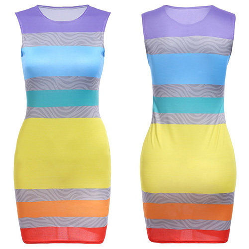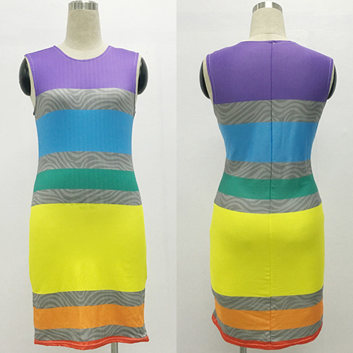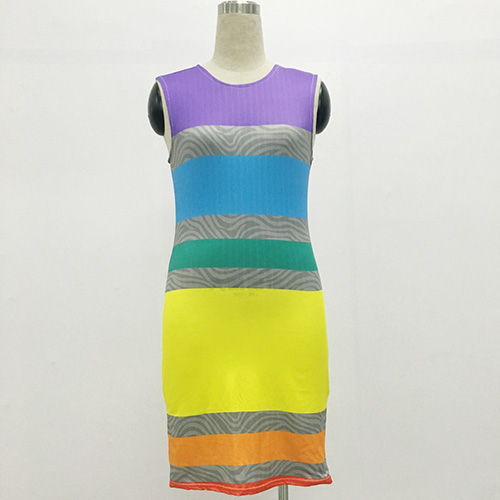 Start your wonderful day from this delicate dress. Rainbow striped style,with sleeveless,round neck