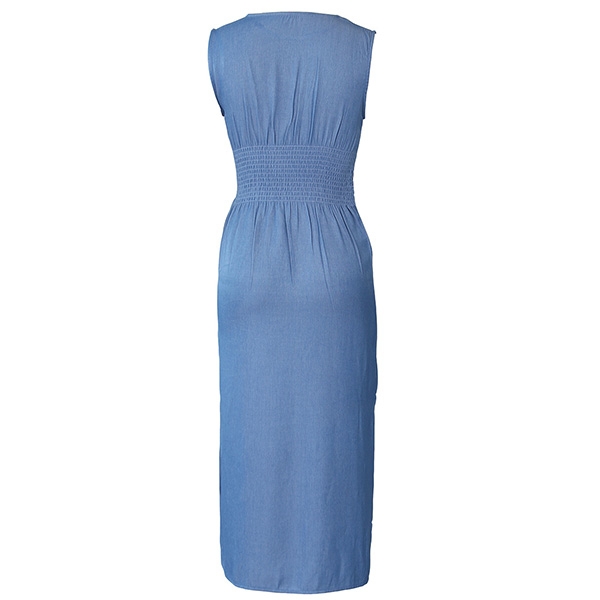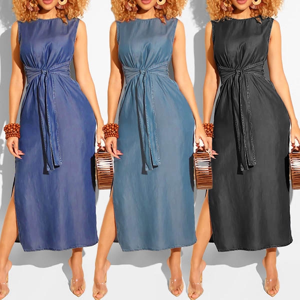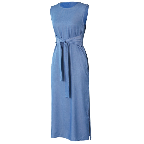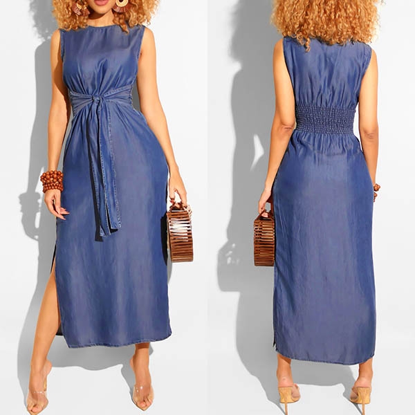 It is a good chance to update your daily style with this denim dress. Finished with sleeveless,