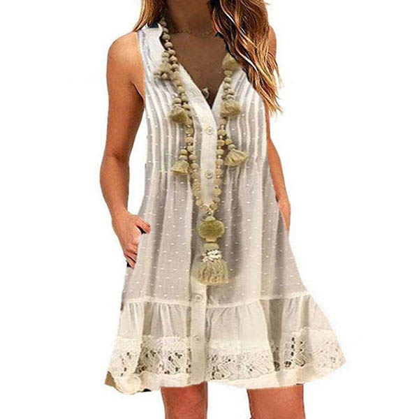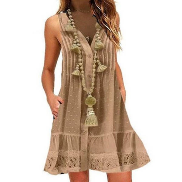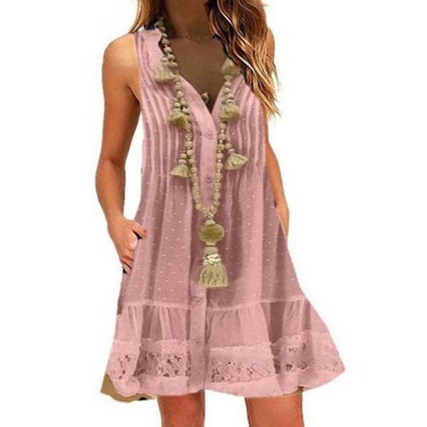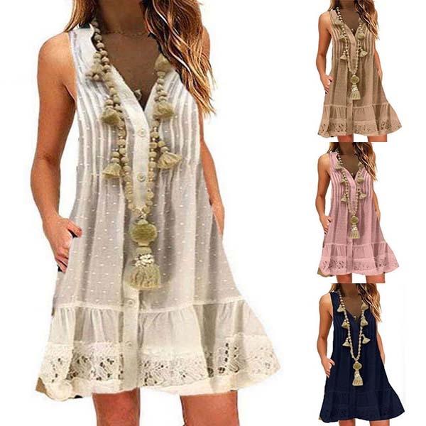It is finished with sleeveless,v-neck,lace spliced hem and a loose silhouette,this piece can