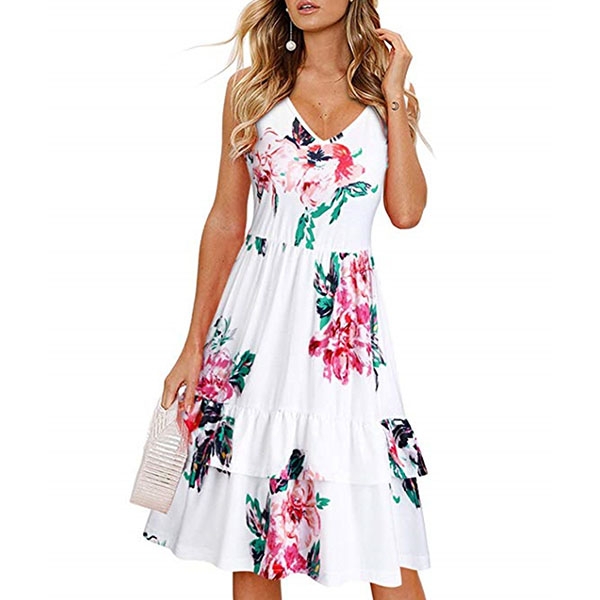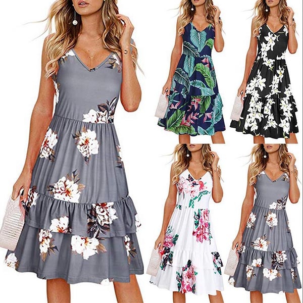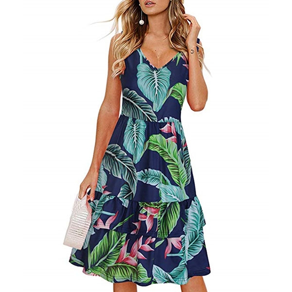 with vibrant floral print details,with sleeveless,v-neck and ruffle hem design,this dress