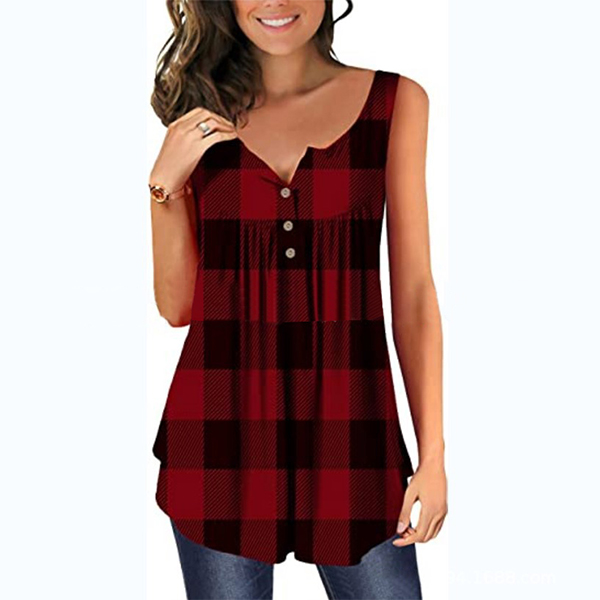Fashion Plaid Printed/Ccamouflage Printed Sleeveless Buttoned V-neck Top