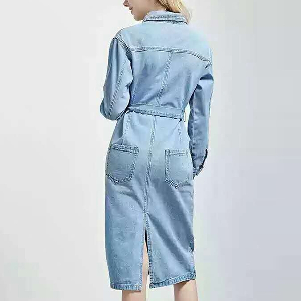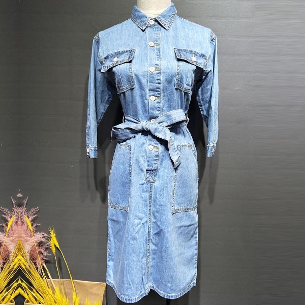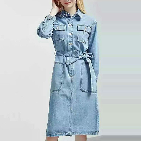 two patch front pockets, long sleeve with button closure cuff, tie a sash to show your slender waist line.