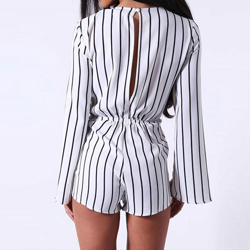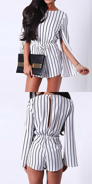 Such a chic and unique romper! Striped style,with long sleeve,round neck and an elastic