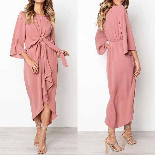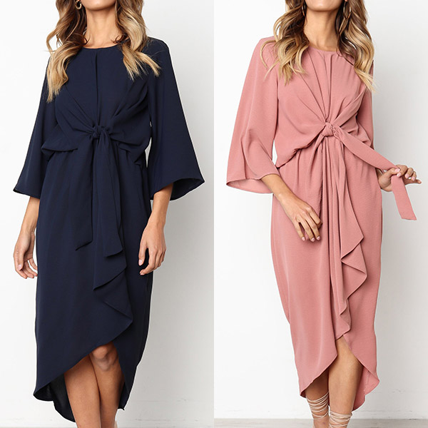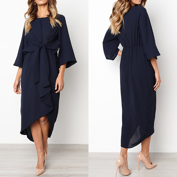 Solid color style,finished with 3/4 sleeve,round neck and an irregular hem,chic and stylish.