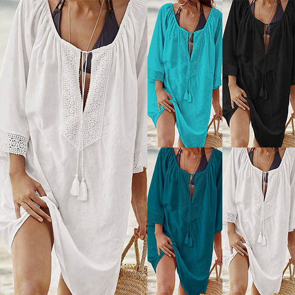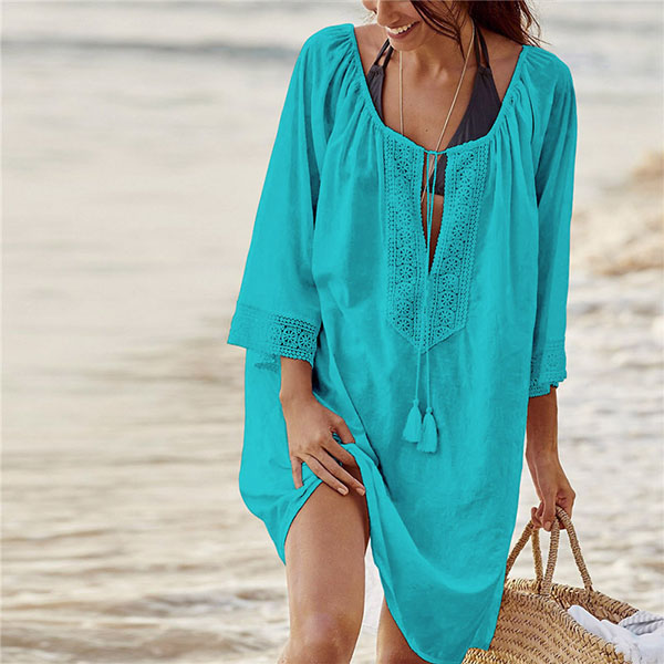 Fashion Solid Color 3/4 Sleeve Lace Spliced Bikini Smock
