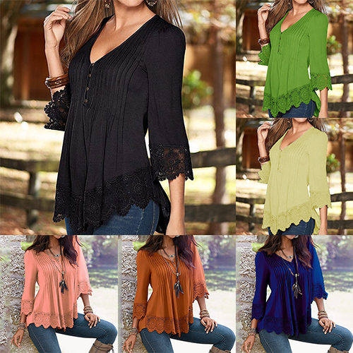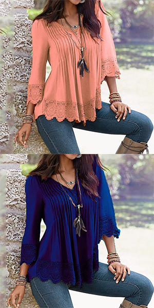 color style,designed with 3/4 sleeve,v-neckline and a relaxed silhouette. Lace spliced details make this tops more