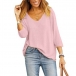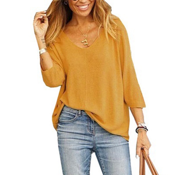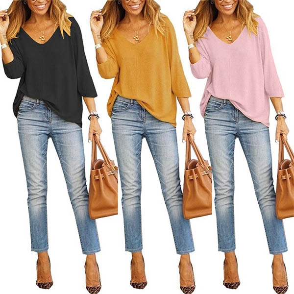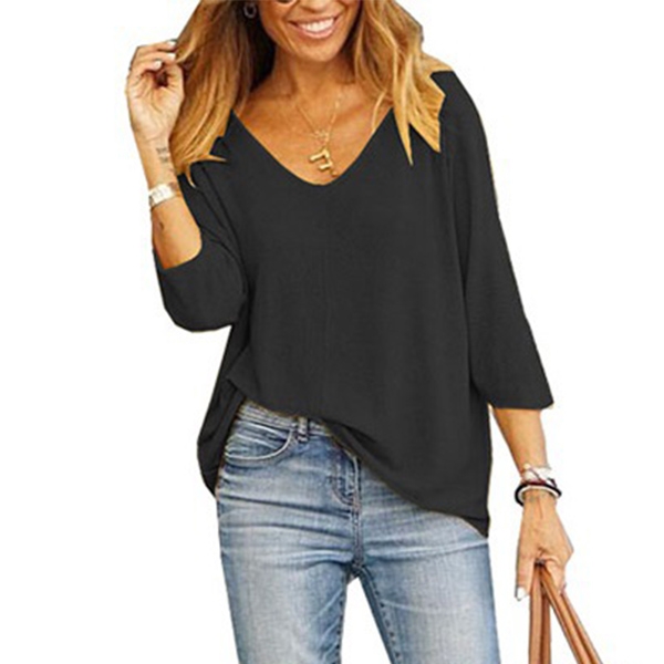 a solid color,outfitted with 3/4 sleeve,v-neck and a loose silhouette,this t-shirt is sure to offer you an