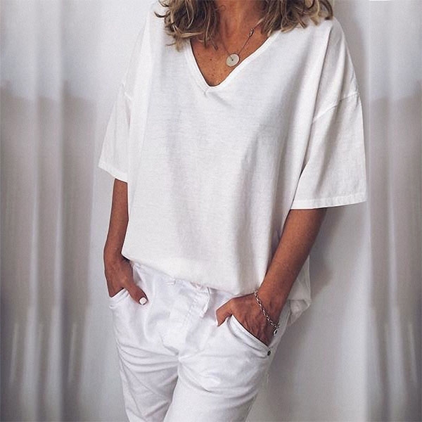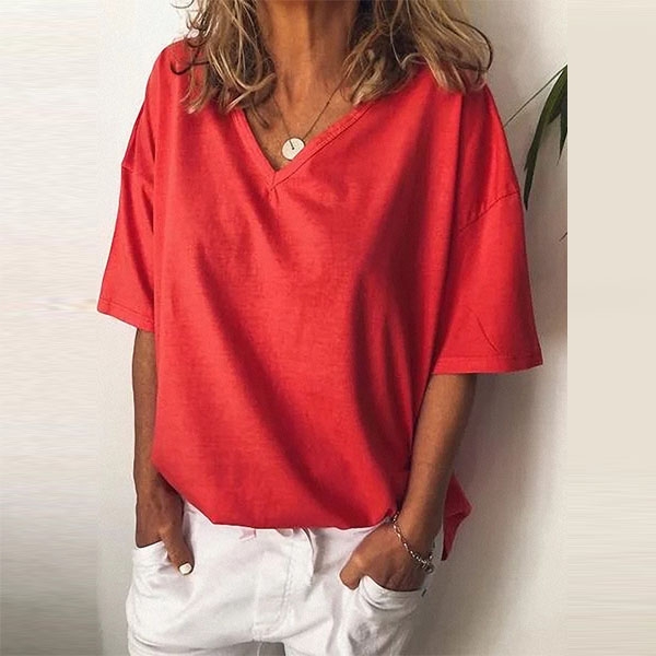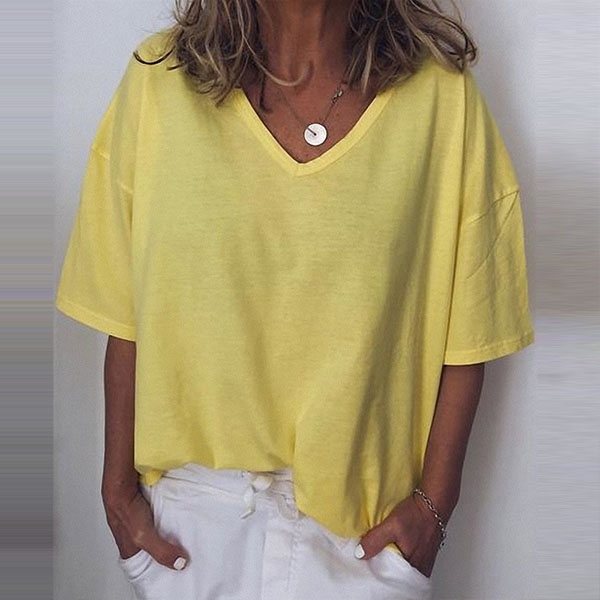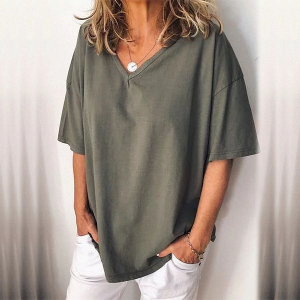 This t-shirt boasts solid color style,the v-neck and loose silhouette details will make this piece look