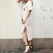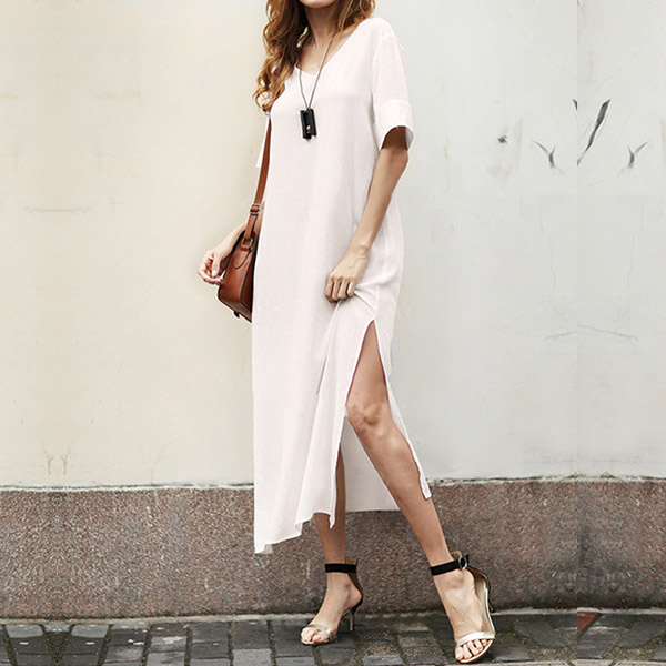 woven,with deep v-neck and short sleeve.Side-slit design can set off your fair skin and slender legs.