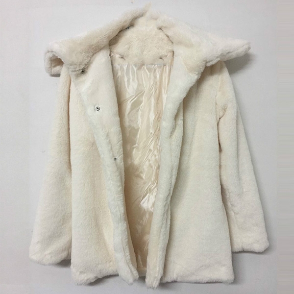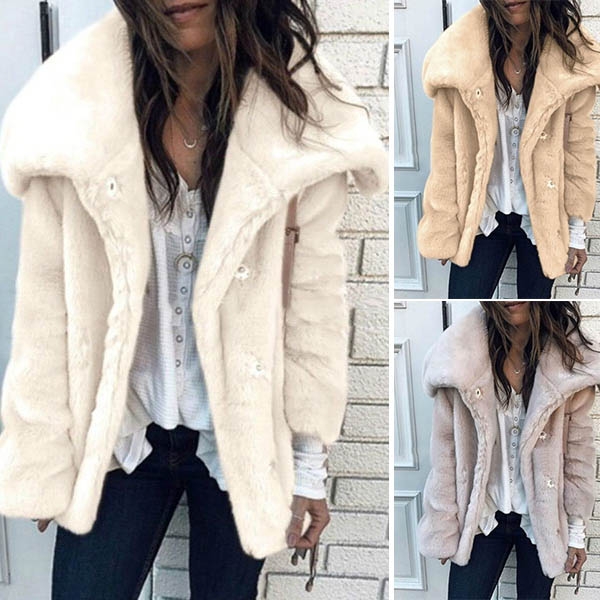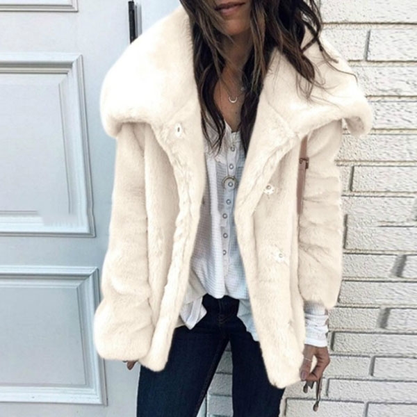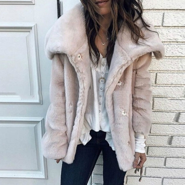 is designed in plush faux fur with large lapel collar and is finished with button front design, long sleeves,
