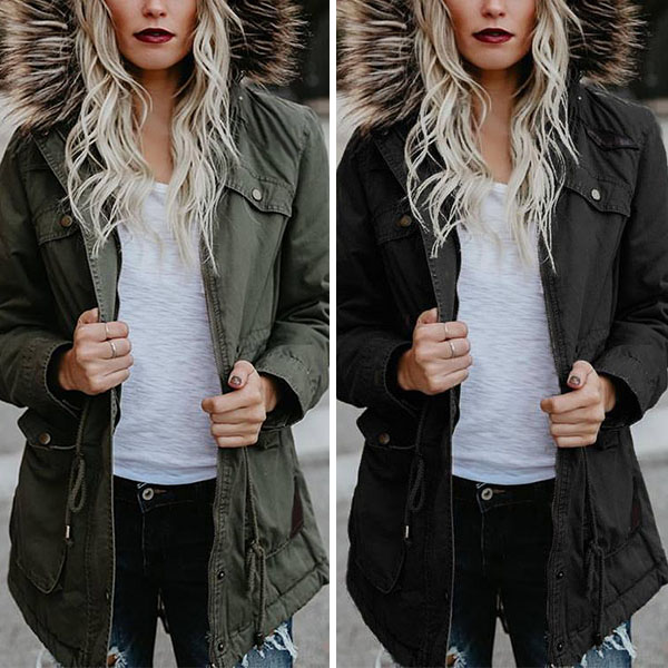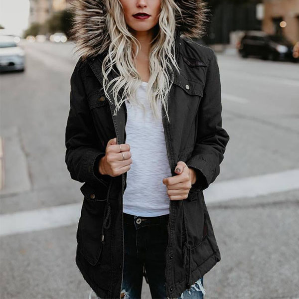 designed with long sleeve,faux fur spliced hooded silhouette and drawstring waist,this classic yet stylish