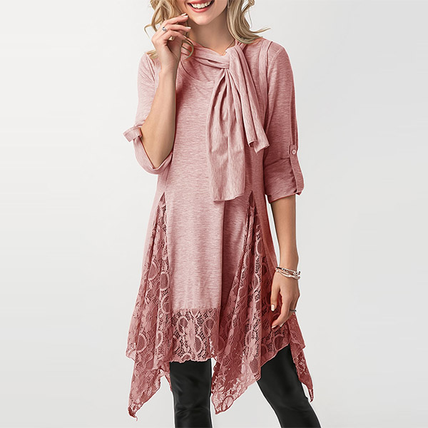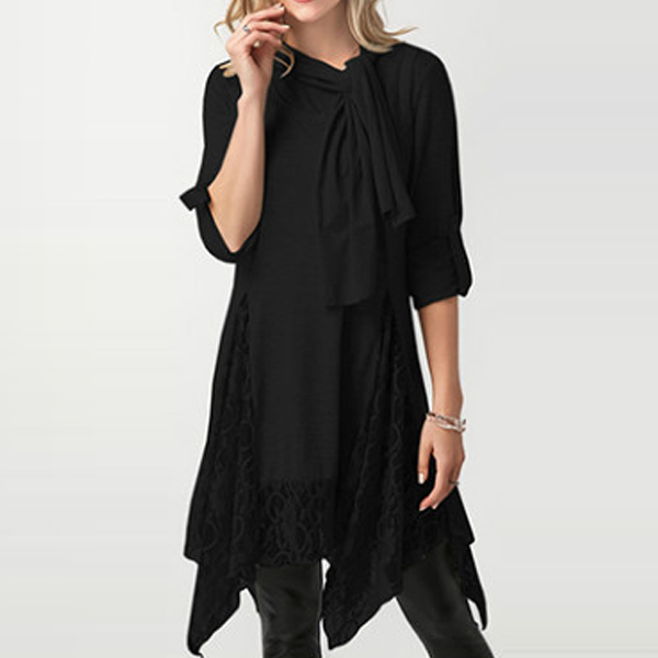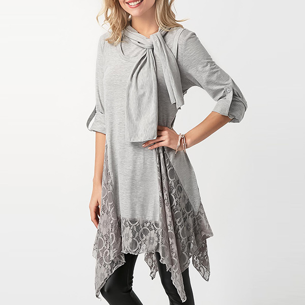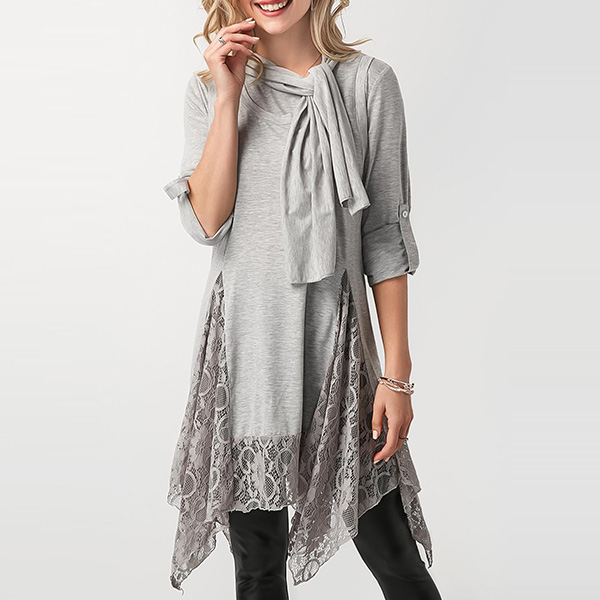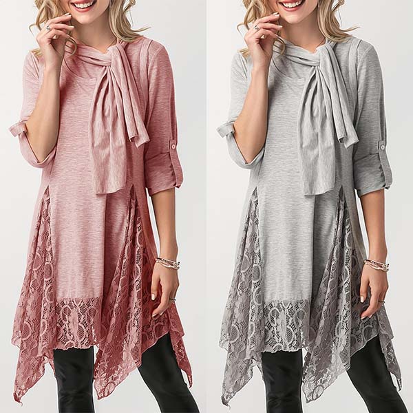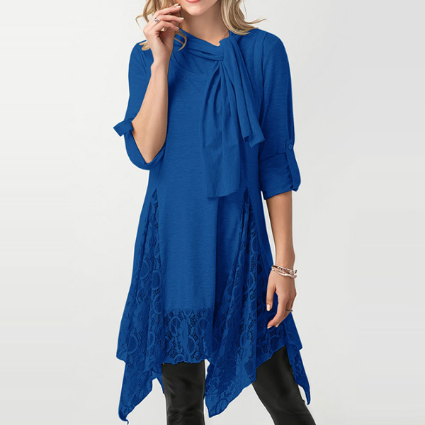 collar and lace spliced irregular hem design make this piece look so distinctive and attractive. Thanks