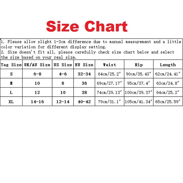 XL : Waist : 79cm(31.1"); Hips : 104cm(40.94"); Length : 65cm(25.59");