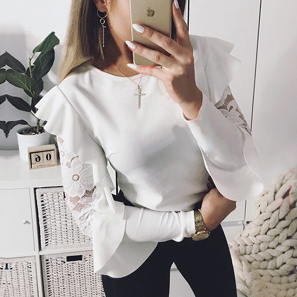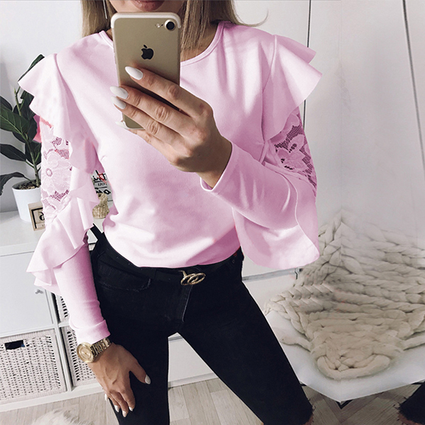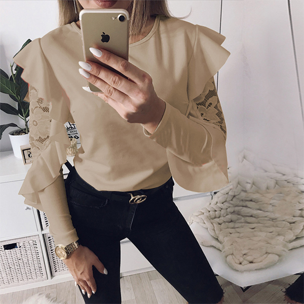This t-shirt features a solid color style,the lace spliced lotus sleeve design is the highlight,which makes this piece