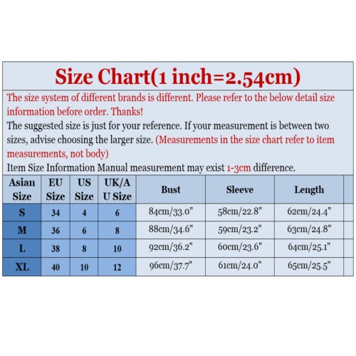 XL : Bust : 96cm(37.8"); Sleeve : 61cm(24.02"); Length : 65cm(25.59");