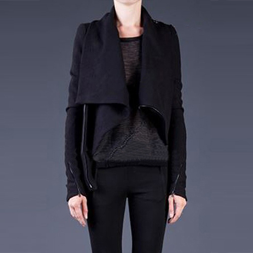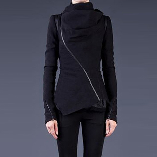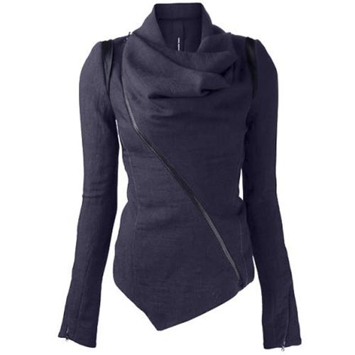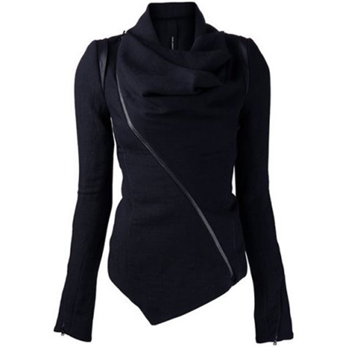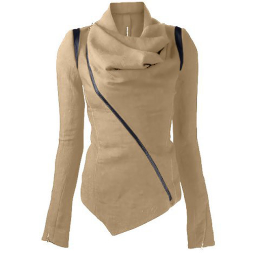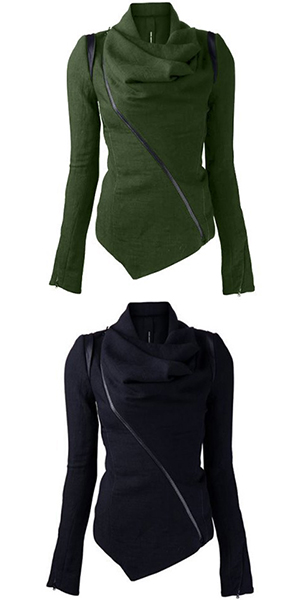 Solid color style,its refined designs such as cowl neck,irregular hem and oblique zipper make